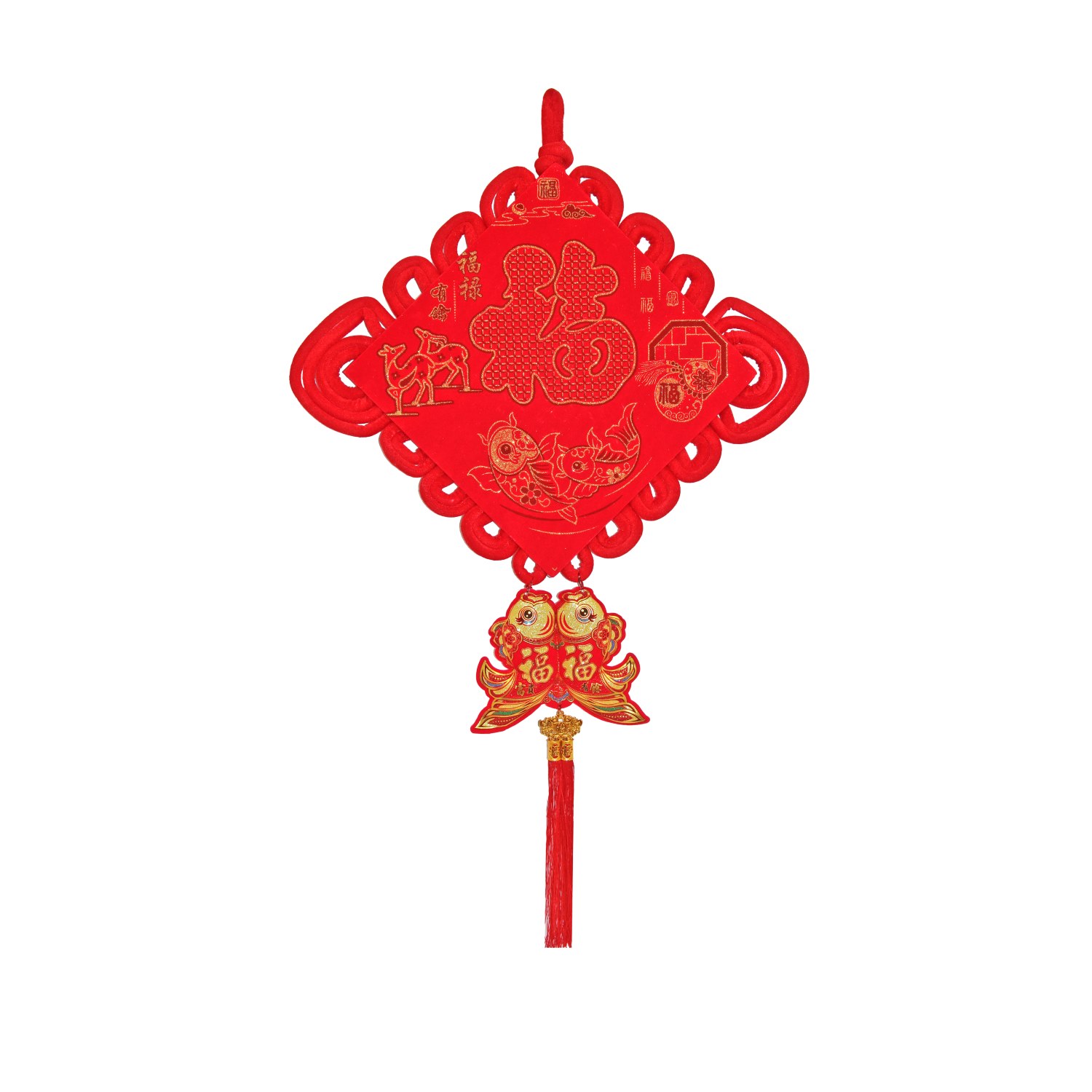 Традиционный китайский узел в форме ромба с символичным дизайном. Яркое сочетание красного бархата и золотых элементов создает эффектный акцент в интерьере.