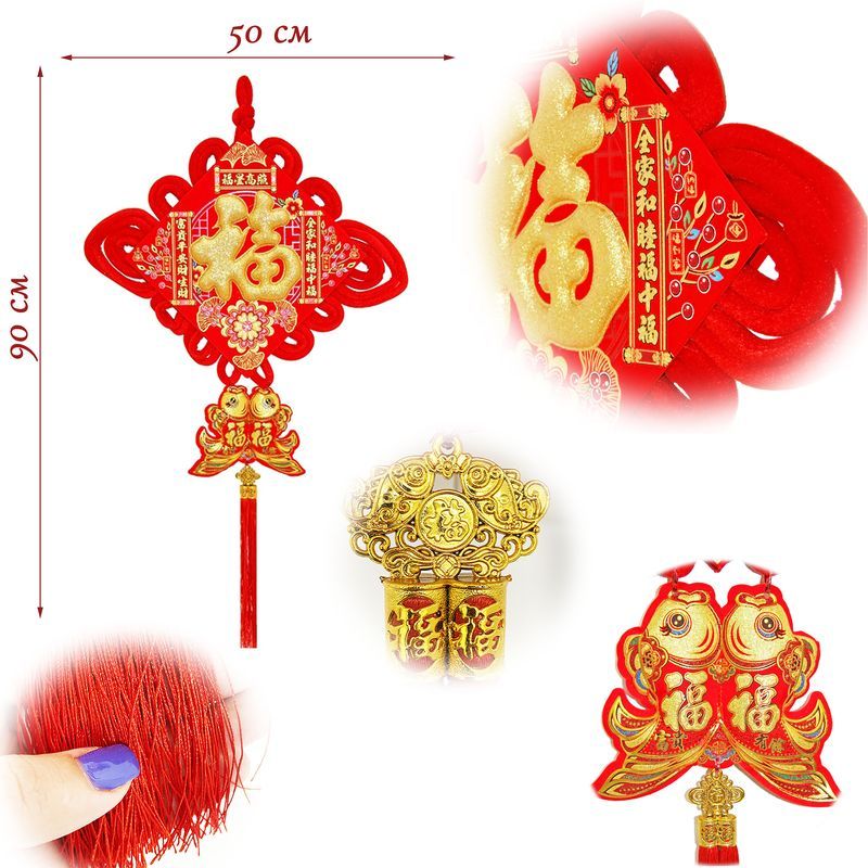 Традиционный китайский узел в форме ромба с символичным дизайном. Яркое сочетание красного бархата и золотых элементов создает эффектный акцент в интерьере.