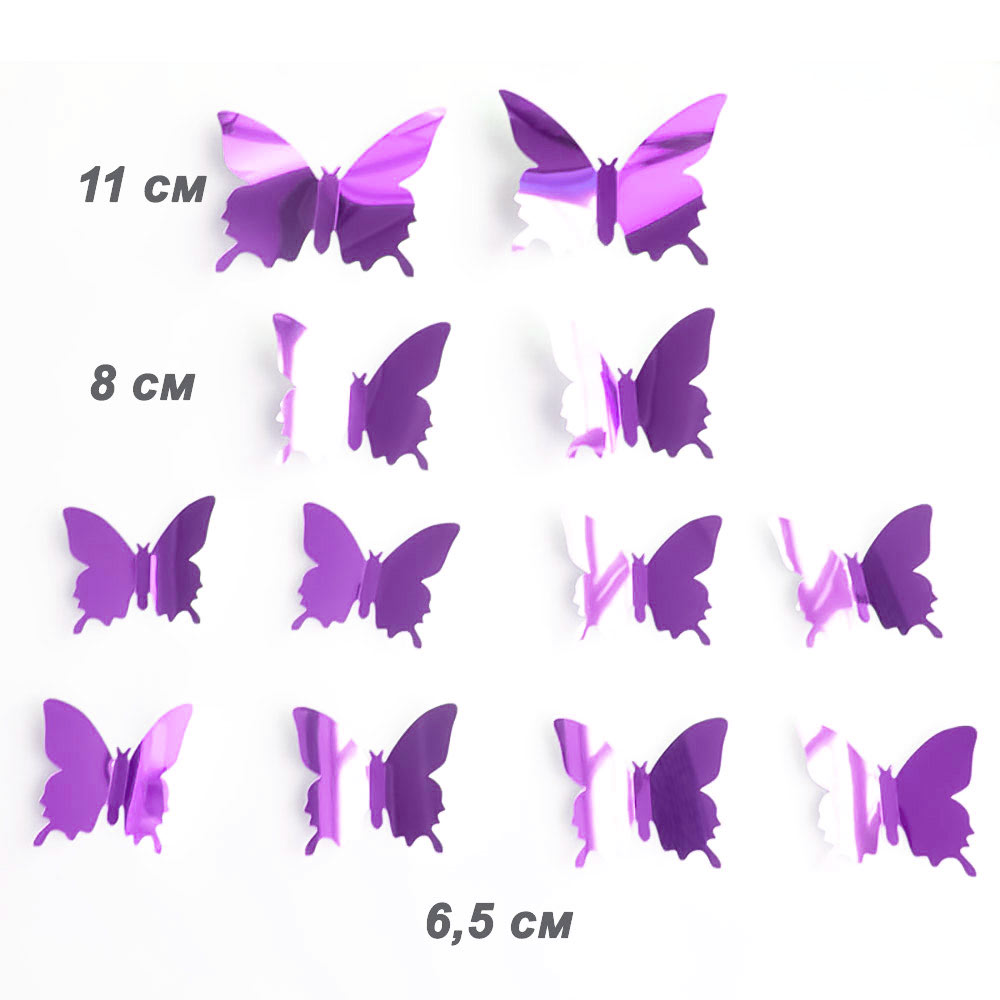Пластиковые бабочки, двухцветные с внутреней стороны серебро, крепятся с помощью двухсторонней клейкой ленты, которая идет в комплекте.