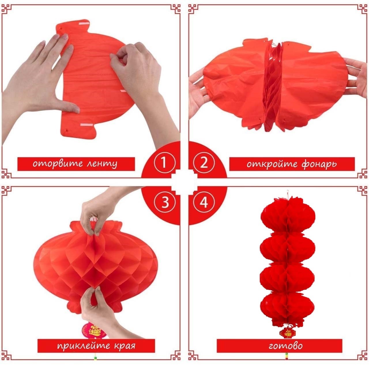Простота в использовании: Бумажные фонарики имеют форму пчелиных сот с плотными отверстиями, их легко разворачивать и сворачивать. Раскройте концы и склейте их вместе (белая липкая двусторонняя лента на одном конце). Красный бумажный фонарь с кольцом и веревкой сверху легко подвешивается и снимается.
