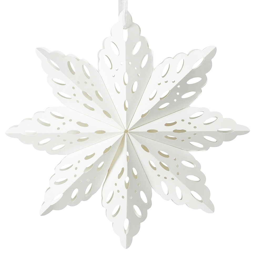 Элегантная объёмная снежинка из плотной бумаги белого цвета — изысканное украшение для зимнего интерьера, витрин, залов и новогодних фотозон. Ажурный рисунок придаёт ей лёгкость и воздушность, создавая ощущение снежной свежести и уюта.