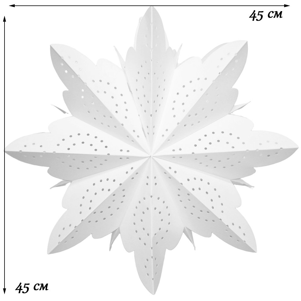 Снежинка на липучках размером 45 см, белого цвета, изготовлена из высококачественной бумаги.