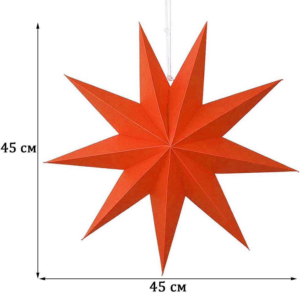 Объёмная девятиконечная звезда 45 см — декоративный элемент для интерьера и праздничного оформления. Лёгкая интерьерная звезда из картона хорошо держит форму и создаёт выразительный объём. Поставляется в сложенном виде, в комплекте шнур для фиксации объёма и подвеса.