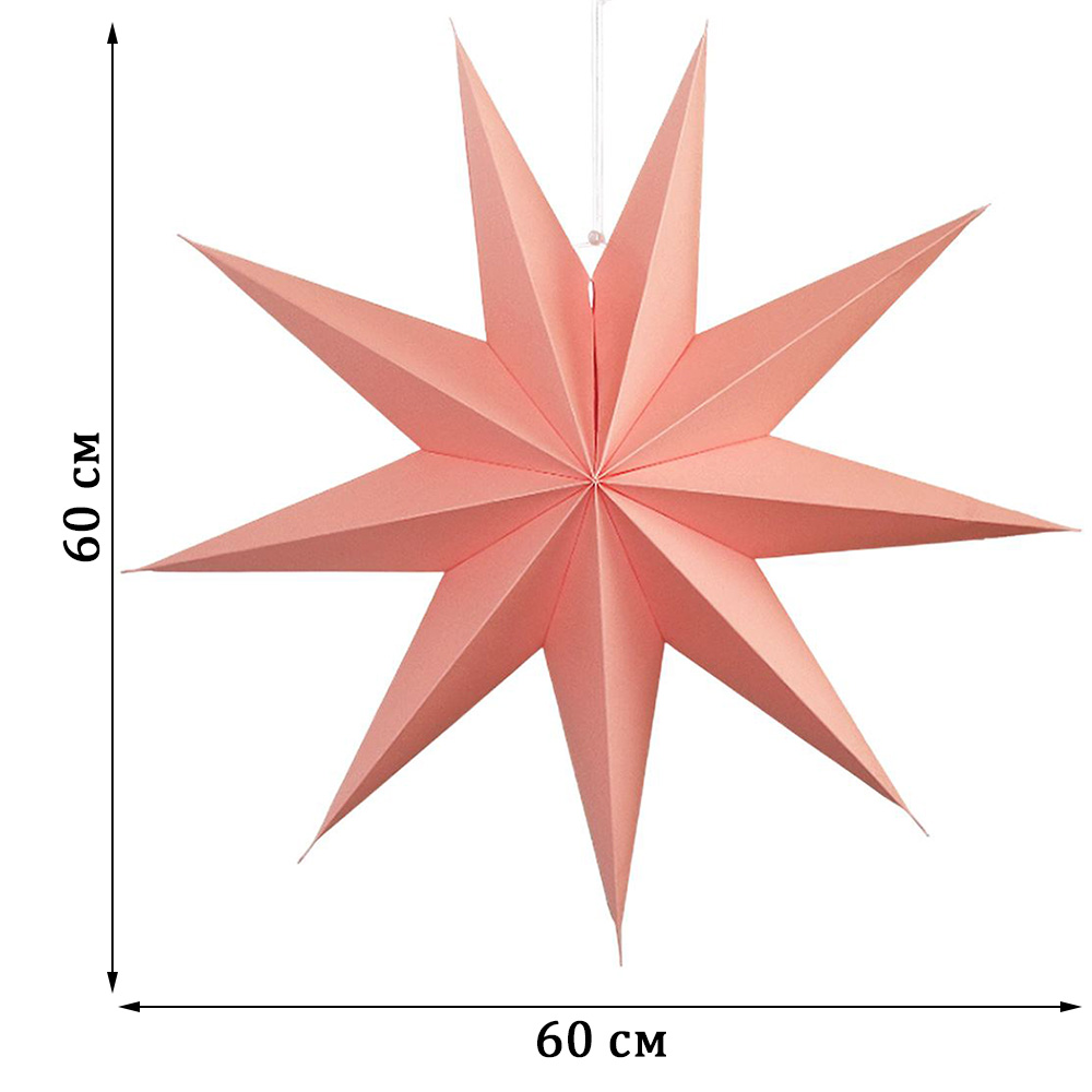 Объёмная девятиконечная звезда 60 см — декоративный элемент для интерьера и праздничного оформления. Лёгкая интерьерная звезда из картона хорошо держит форму и создаёт выразительный объём. Поставляется в сложенном виде, в комплекте шнур для фиксации объёма и подвеса.